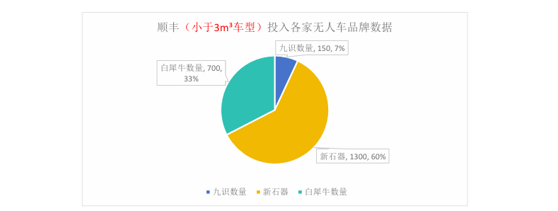 据了解,顺丰目前采用车型几乎全部是货箱体积不大于3m³的小型车,以租赁为主,主要来自两家其投资的无人车企业——新石器和白犀牛,其中新石器约占63%,白犀牛约占34%,九识占比较少。据悉,顺丰也已经开启招标计划,将逐步增加中大型车辆的比重。