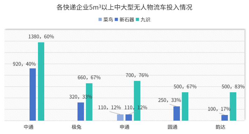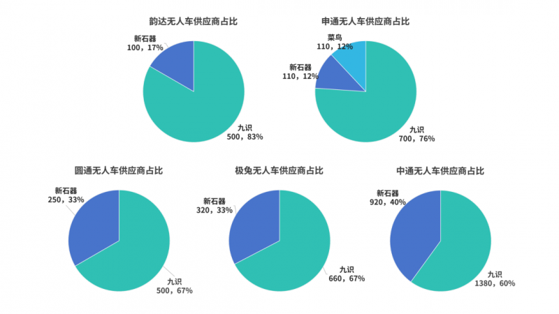 圆通和极兔的无人车供应商占比雷同,有67%来自九识,33%来自新石器。韵达的无人车则有83%来自九识,17%来自新石器。