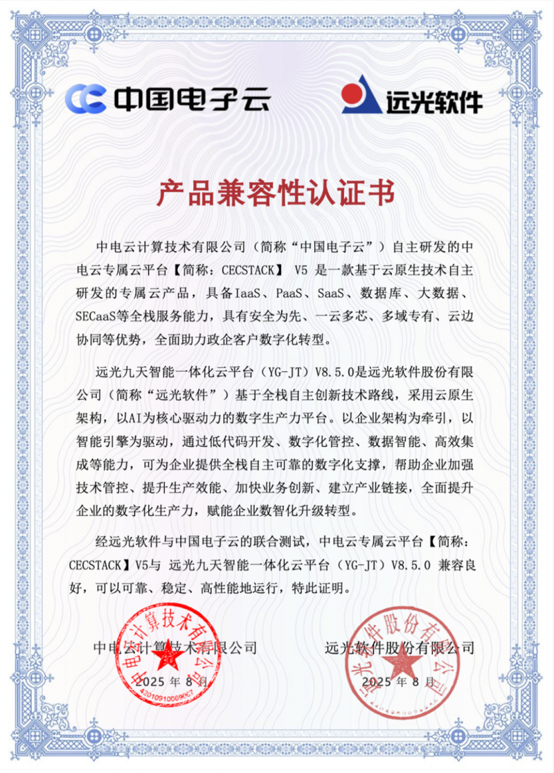 近日,远光软件自主研发的九天智能一体化云平台(YG-JT)与中国电子云·中电云专属云平台V5版本完成双向兼容性互认证。