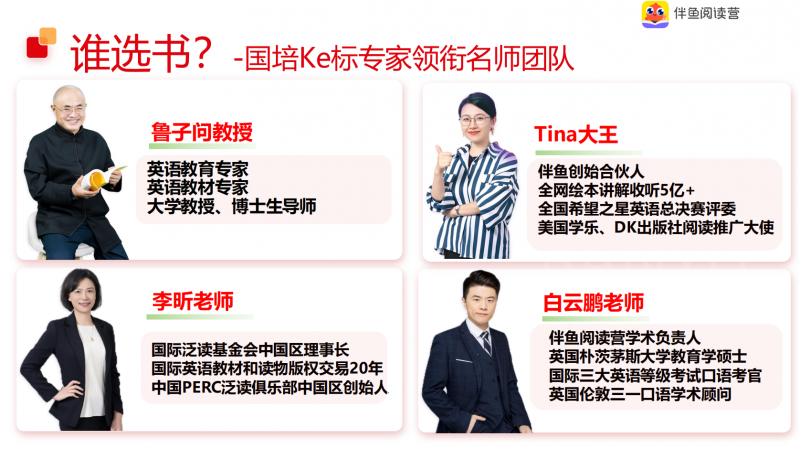 伴鱼阅读营的破局之道,首先是汇聚顶尖教育资源。陈阳介绍,团队核心专家团队包括:国培课标专家、博士生导师鲁子问教授,负责把握课程方向与课标对接;国际泛读基金会中国区理事长李昕,拥有 20 年国际英语教材版权交易经验,负责读物筛选;伴鱼创始合伙人 Tina 大王,全网绘本讲解收听量超 5 亿,负责课程主讲;英国朴茨茅斯大学教育学硕士白云鹏,曾任国际英语考试口语考官,负责学术设计。“这些专家的加入,确保了课程内容的专业性与权威性,相当于让每个孩子都能享受到‘名师授课’的待遇。”