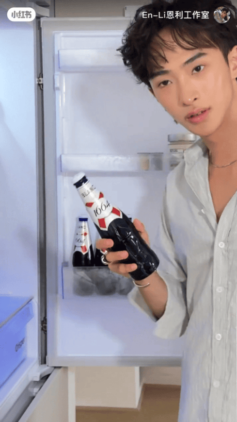 小红书KOL则从头部到腰尾逐层打样,带动UGC模仿生成,结合记忆锚点——1664小蓝瓶转场动作,提升内容统一性与品牌识别度。