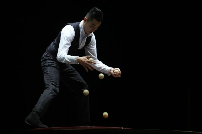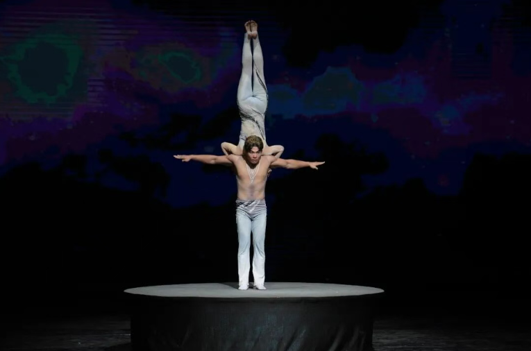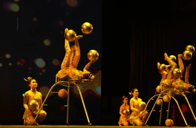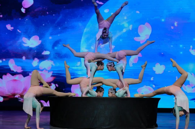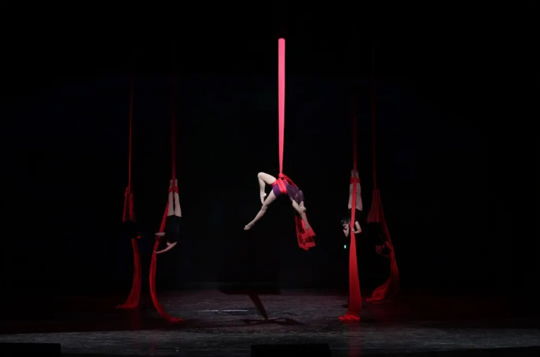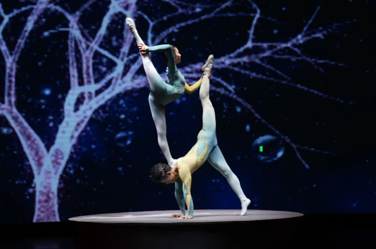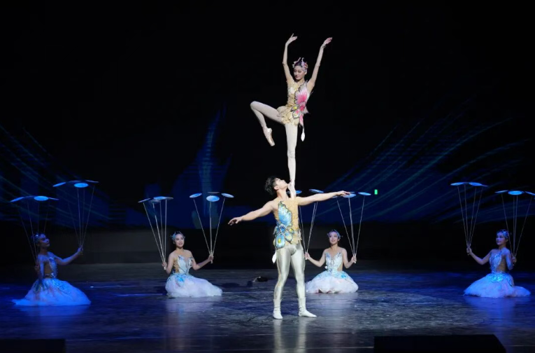 演出开始,《女子柔术·花之韵》率先登场,豆蔻年华的演员们以轻盈身姿完成行云流水的叠加造型与四节元宝倒立,在现代节奏中绽放青春活力;《手技·灵动》则切换风格,演员以手指精准控制不断增加的彩球,节奏渐快如自由奔放的奏鸣曲,展现非凡控制力;《集体绸吊·光源》更以流动的红绸为载体,用意境式表达刻画生命起源与成长,传递对生命的敬畏;《椅子顶·上升的骨架》则通过不断攀高的椅架,诠释建筑与文明的重量。随后《男女软功·梦蝶》《集体空竹·龙腾九州》《男女力量·力与美》《双人皮条·情迷夜空》《球技·金色畅想》等节目接连上演,为观众持续带来多元杂技魅力;作为压轴的《肩上芭蕾——化蝶》尤为亮眼,该节目创新性融合中国杂技与西方芭蕾,被誉为“惊险的杂技、优雅的芭蕾”,将整场演出推向高潮。