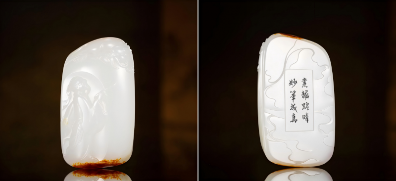 特别是在作品背面琢刻洗练的文字或简洁的诗词,将诗、书、画统一表现在和田玉上,体现了玉雕艺术的精细文人风尚,延续着七千年未断的工艺传承。
