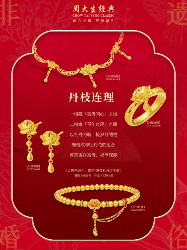 此次周大生经典金妆婚嫁季不仅是一场文化盛宴,更是一次对东方美学的深情致敬。周大生经典以国家级非物质文化遗产——汉族传统婚俗为笔,将美好寓意凝于金饰之上。国色牡丹,雍容华贵,自古便有“花开时节动京城”的美誉。它不仅是富贵荣华的象征,更被赋予婚姻美满、爱情圆满的美好寓意。周大生经典·金妆囍事系列“丹枝连理”,汲取南宋·缠枝牡丹纹玉梳之灵感,将传统美学与婚庆文化巧妙融合。丹枝连理之上,牡丹盛放,层层叠叠的花瓣尽显娇艳华美,在群芳中独占鳌头,于婚礼之上绽放夺目光彩。