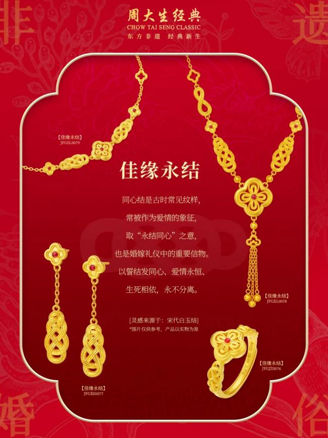 岁月悠悠,柔韧丝线在时光中交织缠绵,仿若情丝,密织成同心结。作为古时常见的经典纹样,同心结承载着深厚的文化意蕴。在古代婚嫁的“合髻”仪式上,新婚夫妻各剪下一缕头发,合而作一结,以誓天赐良缘,更寓意从此结发同心、患难与共。周大生经典取同心结之意,赋予金妆囍事系列“佳缘永结”“情深意结”之形。每处细节都几经打磨,编织出情丝万千,赠予东方佳偶,盟定今朝好姻缘。同心结的中心亦缀有红色珐琅,如同爱情的核心,炽热而坚定;亦祈愿情长岁久,永不渝初。