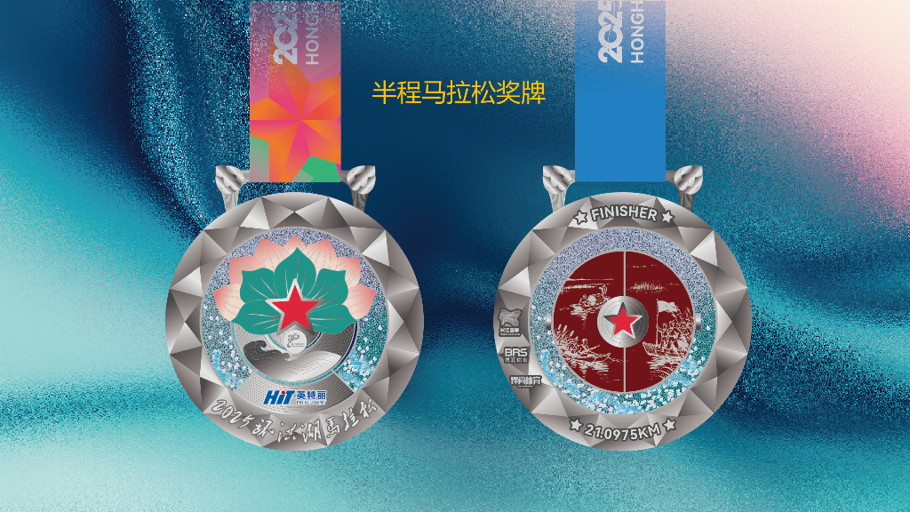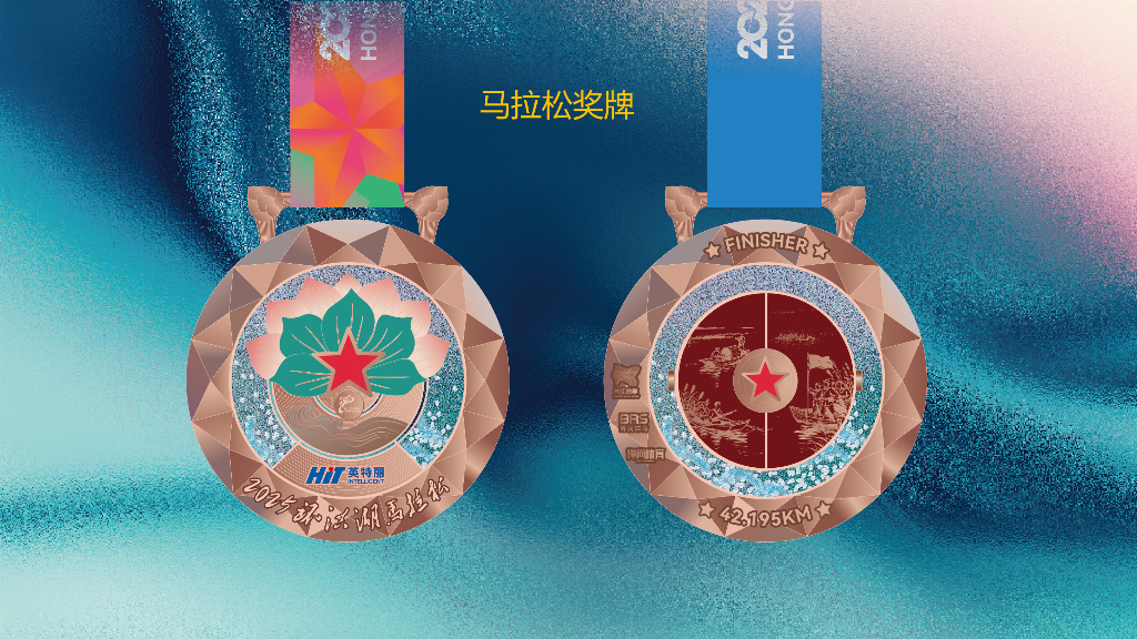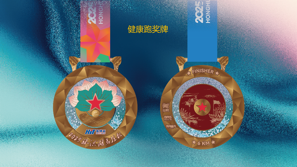 湖北体育产业集团党委副书记、副总经理张少武介绍,全马、半马、健康跑奖牌分别采用古铜色、古银色和古金色,正面以浮雕工艺呈现盛放荷花与莲叶的景象,象征洪湖“百里荷廊”的生态名片。奖牌中央镶嵌红五角星,致敬洪湖红色历史。背面则通过微雕工艺再现《洪湖赤卫队》经典场景。全马、半马奖牌还创新设计了“开合装置”,内藏水墨风格洪湖生态长卷,沙粒流动模拟湖波荡漾,寓意跑者与自然共鸣。
