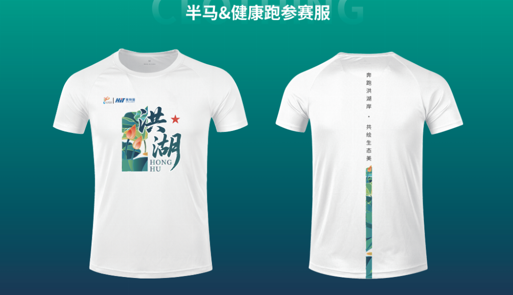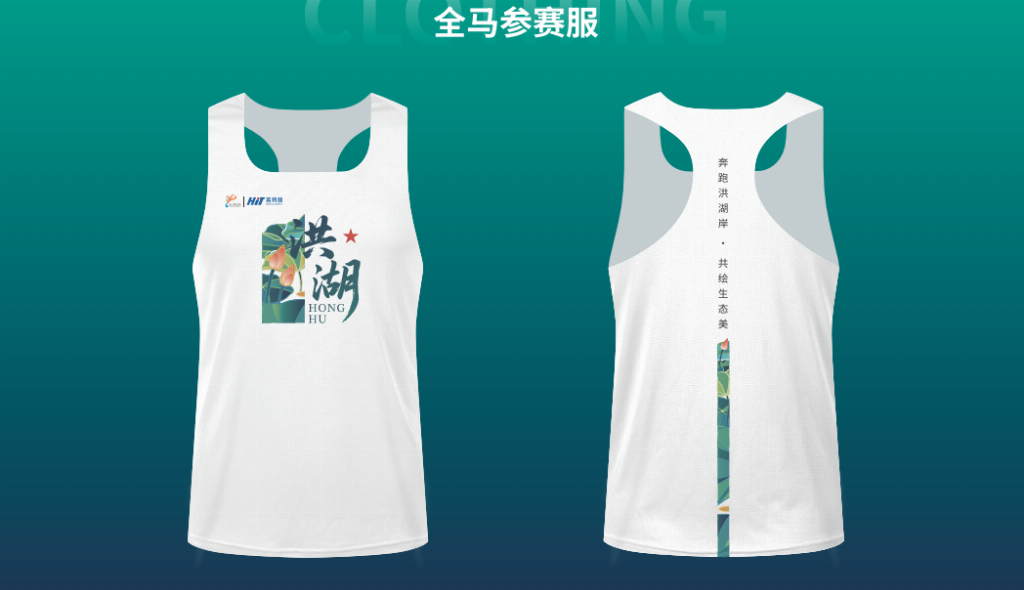参赛服装以白色为底,正面印有“洪湖”中英文字样及荷花图案,背面标注赛事主题“奔跑洪湖岸・共绘生态美”,整体设计简洁雅致,凸显洪湖生态气质。