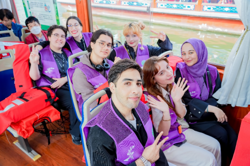 随后,他们登上游船,沿北运河徐徐前行,六座形态各异的大桥如时代的音符依次掠过,两岸绿意盎然的生态景观与古老的漕运历史遗迹交织成一幅流动的画卷,让大家在实景中感受运河的变迁与传承。