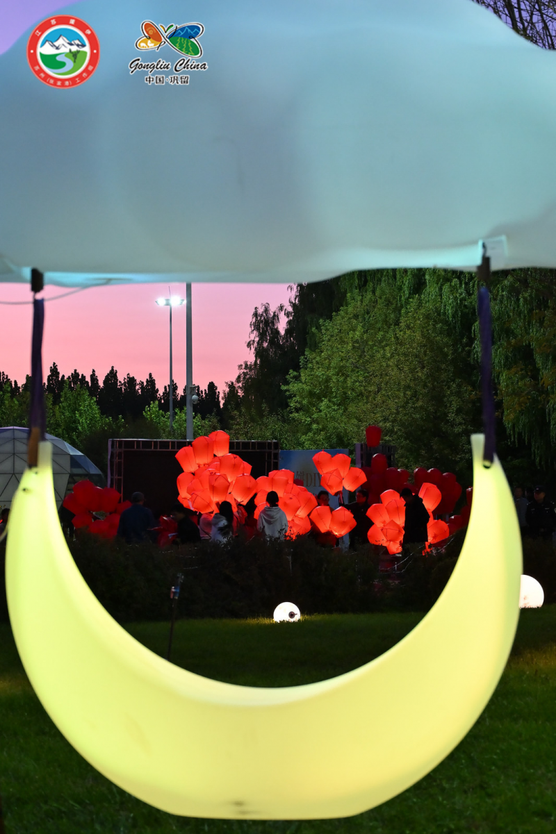 同时,一座直径达5米的发光月亮灯将悬浮于蝶湖水面,与水中倒影及北广场的实体月球模型遥相呼应,共同构成“双月同辉”的奇幻盛景。夜幕降临,湖中月亮灯与湖畔点缀的小型月亮灯、蝴蝶灯一同点亮,营造出如梦如幻的夜间游园体验。围绕湖畔设置的多个发光月球装置内置灯谜二维码,游客可扫码参与互动,在赏月、玩月、解谜的过程中,体验“月下重逢”的传统文化与现代趣味结合的乐趣。一系列活动展现了巩留"以文促旅、以旅彰文"的显著成效。