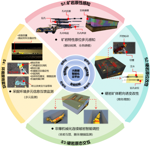 硬岩矿体普遍采用钻爆法采掘,其作业危险性大、效率低、破坏扰动大、智能化困难等问题突出。如何实现深部硬岩矿体的非爆机械采掘是战略性矿产资源安全、高效回采的关键。王少锋教授通过开展矿岩原性感知、硬岩原位改性、破岩原态交互和环境原场监控“四原”协同技术研究,构建深部硬岩非爆机械智能采掘方法与技术体系,形成新型采掘模式,实现矿岩特性原位多元感知、硬岩矿体靶向诱变改性、非爆机械连续破岩智能调控以及采掘环境多信息互馈监测,并通过大数据智能化云平台将上述过程协同链接,实现采掘过程感知、评价、决策、执行、调控、反馈的自组织进行,形成聪慧感知、智慧决策和智能控制协同闭环,从而实现深部硬岩机械化、智能化采掘,促进深部硬岩从“钻爆法采掘”到“非爆连续采掘”的技术变革。