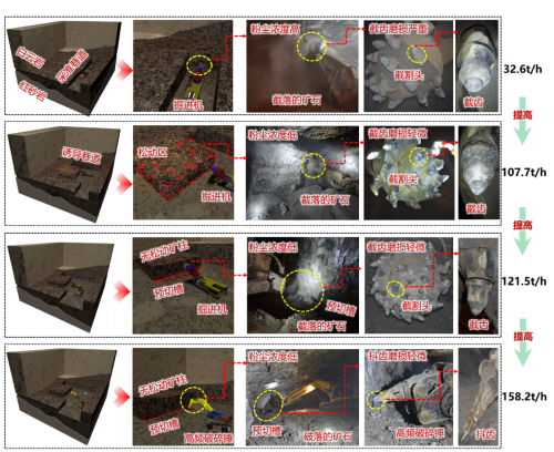 深部硬岩矿体坚硬、地应力高、岩爆风险高、可切割性低,这是采矿科研工作者面临的共同难题。通过大量室内试验与现场验证,王少锋教授团队揭示了岩性特征、地应力条件、机械破岩参数等对破岩效能的影响规律,提出基于高应力诱导调控和孔阵脉冲水力压裂协同作用的深部硬岩诱变改性方法,即通过开挖诱导工程,引导高应力释放并致裂矿岩产生松动区,实现深部高应力由“致灾”向“致裂”的属性转变,体现“降危”(降低岩爆风险)和“增割”(提升岩石可切割性)的双重效果。该方法在矿山现场进行了应用试验,硬岩矿体诱变后多截齿旋转切割破岩方法的采矿效率从32.6 t/h提高到107.7 t/h和121.5 t/h,液压高频冲击破岩方法的采矿效率从49.6 t/h提高到158.2 t/h,实现了深部坚硬矿体的非爆机械开采,为深部硬岩矿体传统钻爆法开采提供了可行替代方案,有效提高了战略性矿产资源的开采效率。