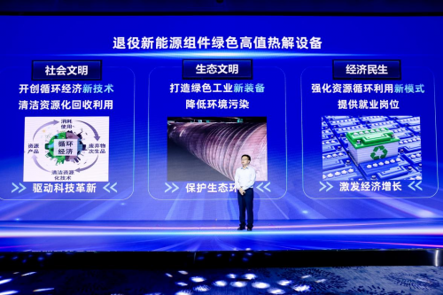 该技术突破了传统处理方式存在的高能耗、低回收率、品质差等行业瓶颈,通过在绝氧条件下高效、低能耗解离退役组件,实现了石墨、战略金属及晶硅电池片等高价值组分的高纯度回收,真正做到了退役组件的全量高值利用。在“双碳”战略深入推进的背景下,该项技术创新不仅突破了传统工艺瓶颈,填补了行业空白,更重要的是为全球新能源产业循环发展提供了切实可行的技术路径。