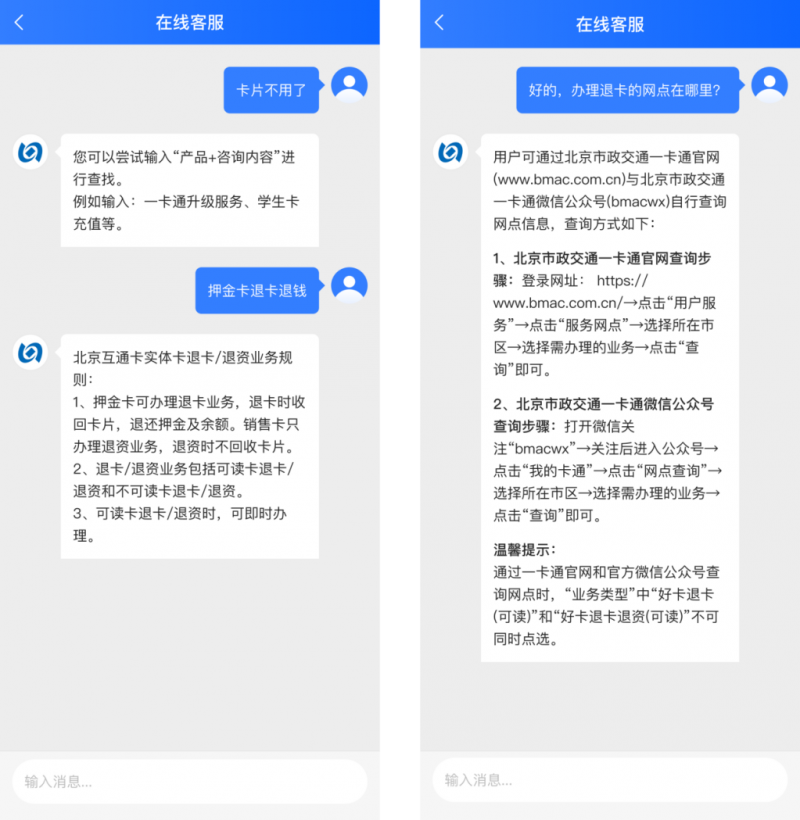 “传统客服机器人的多轮对话能力比较弱,比如上面的例子中,用户说‘卡片不用了’,机器人无法识别用户的真实意图是要退卡,只有提及精准的关键词‘押金卡退卡退钱’时才能触发回复。如果用户有查询退卡网点的需求,传统客服机器人也无法基于用户所在的位置,提供就近的网点,只能提供网点查询的路径。整个交互方式不是很友好,不符合用户的实际咨询和操作习惯”李妍补充说。