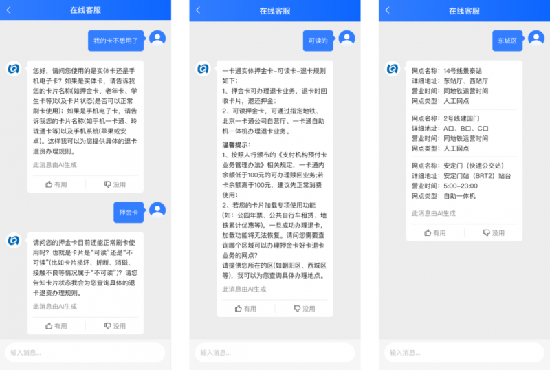 在具体的落地场景选择上,他们的核心标准是“看哪些场景对市民有更高的价值”。通过分析历史的客服会话数据,北京一卡通从市民咨询频次、交互轮次、传统机器人交互体验三个维度进行综合考量,将客服Agent率先应用在解决“退卡退资、网点查询、扣费相关”这三类问题,希望能更加高效地响应市民的需求,并提升整个咨询过程的服务体验。
