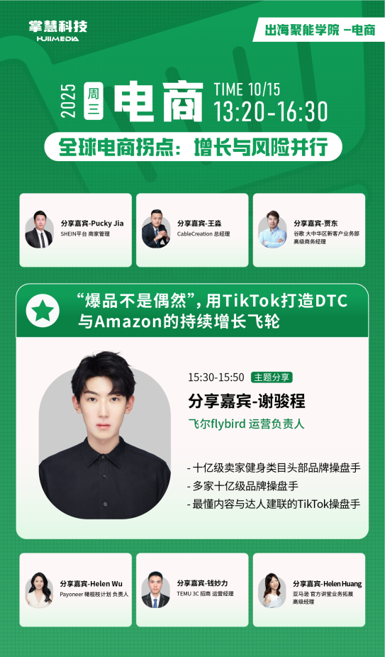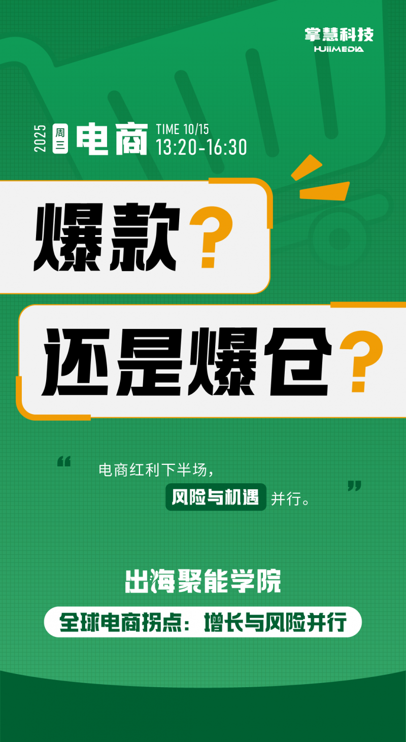 本周三,掌慧科技旗下“出海聚能学院”第二期直播将以 “全球电商拐点:增长与风险并行” 为主题,携手七位来自平台、品牌、支付与营销领域的资深专家,聚焦年底关键战役,为出海企业提供实战思路与策略支持。