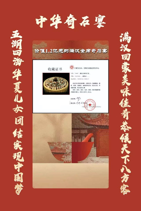 更深远的是,奇石宴承载着宁夏对自身文化价值的自信表达。过去,提及宁夏文旅,人们多想到沙漠、黄河等自然景观;而如今,奇石宴、西夏王陵、镇北堡西部影城等文化IP的崛起,标志着宁夏文旅正从“卖风景”向“传文化”转型。这桌没有香味的“宴席”,就像一个文化纽带:它让外地游客看到,宁夏不仅有壮美的自然风光,更有能与中华优秀传统文化对话的独特文化载体;也让本地群众在观赏中,加深对宁夏“神奇”之处的认知——原来家门口的戈壁石头,能成为走向全国的文化名片。它以自然之美展现“美丽宁夏”的生态底色,以文化之韵凝聚各族人民群众的奋斗力量,更以文旅融合创新的新模式,吸引着八方来客共同感受塞上江南的魅力,为“共圆伟大中国梦”注入宁夏新元素。它将以它独有的方式,(满汉回蒙美味佳肴恭候天下八方客,五湖四海华夏儿女团结实现中国梦)遵循着对联中恭候天下八方客的热情,邀请更多人走进宁夏,读懂这片土地的神奇与深情。