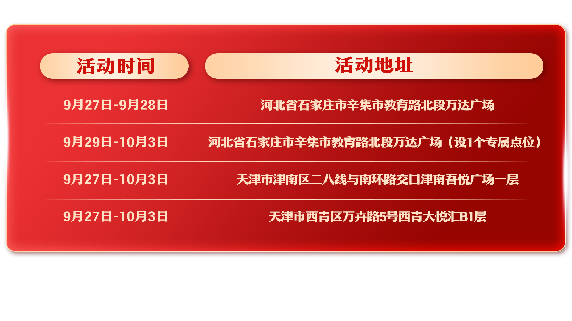 以上的联名快闪店活动,9月27日-9月30日落地河北石家庄辛集市万达广场,为消费者带来“幸福同心圆”空间、六大福运趣味互动游戏、古韵风俗文化汇演等精彩体验。