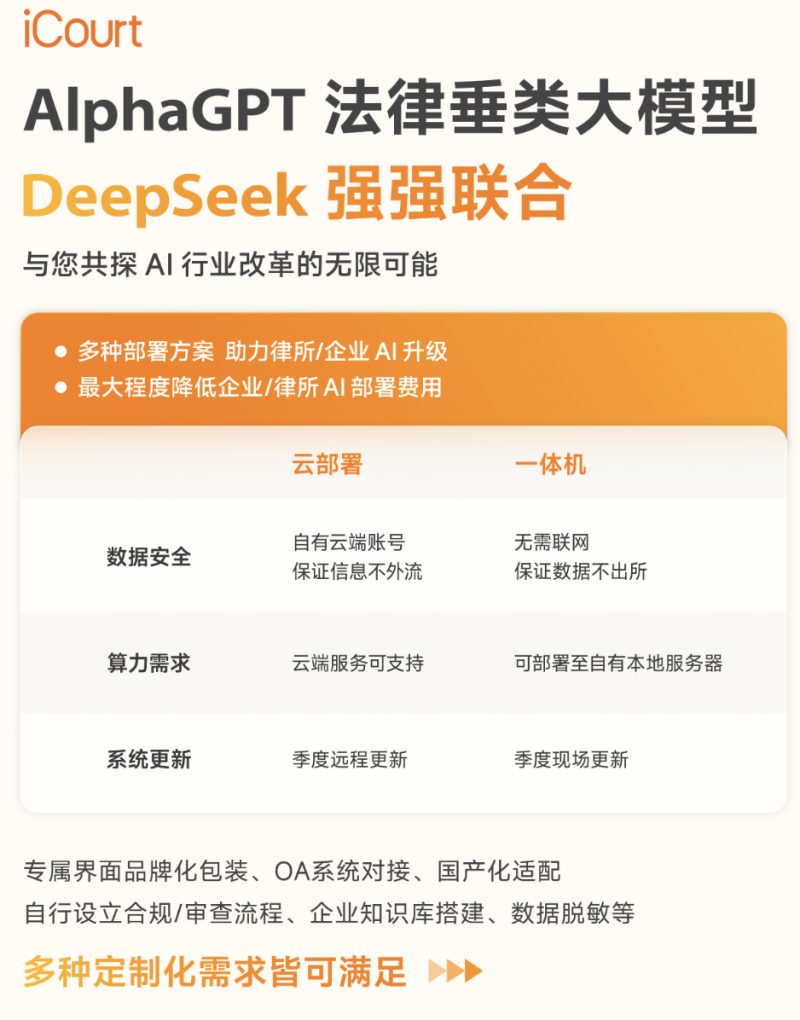 传统云端部署虽能提供灵活算力,却存在三大核心痛点:其一,使用成本持续攀升,长期投入如同滚雪球般递增;其二,数据需经第三方服务器流转,个人隐私、商业机密等敏感信息泄露风险居高不下;其三,合规层面存在不确定性,让法律行业对技术落地路径充满疑虑。在此背景下,iCourt推出的AlphaGPT本地化部署方案,为法律AI开辟了从“工具级应用”迈向“基础设施升级”的关键进阶之路。