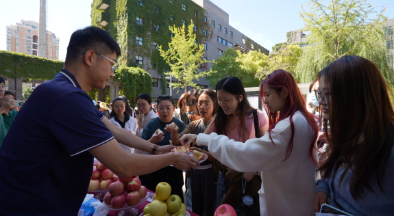 正午时分,北京林业大学食堂门口广场变身延安苹果进高校的“青春市集”,以“一颗苹果念初心、延安精神永传承”为主题的理论宣讲与之无缝衔接:志愿者们变身延安苹果代言人,“花式”带货。