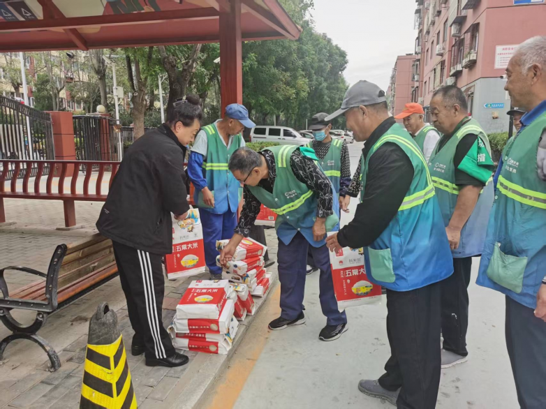 活动当天,秋阳正好,微风不燥。在各个垃圾分类站点,金宇奥的工作人员早早便等候在那里,将提前准备好的优质大米整齐摆放。当垃圾分类工们结束了一上午忙碌的分拣工作,带着些许疲惫走来时,工作人员立刻热情地迎上前,双手将大米递到他们手中,一句句 “中秋快乐”“您辛苦了” 的问候,瞬间驱散了他们工作的疲惫。