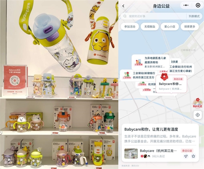 2025年9月,久久公益节期间,国内头部母婴品牌Babycare的全国200多家线下门店加入腾讯公益“身边公益”地图,向公众传递育儿友好的温暖理念。据悉,腾讯公益以“我有一朵小红花”为主题,推出“身边公益”地图,用户在公益地图中的相应地点完成公益行为即可获得“小红花”标识,并可在微信头像状态栏中展示,以此传递公益温度。Babycare的公益加入,旨在为进一步推动母婴领域公益生态的建设贡献一己之力。