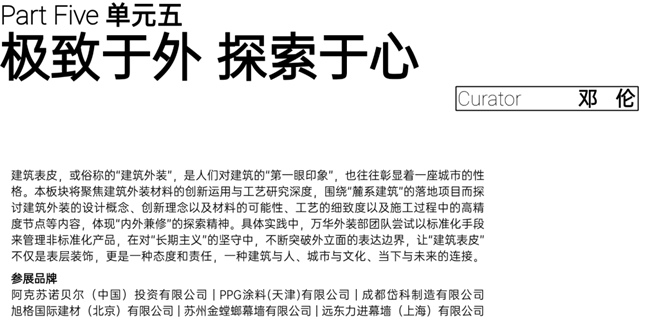 广州建博会统领展览目的,A8设计中心负责策展概念+7个主单元的统筹策划+单元一的策展,万华集团室内设计中心对内容极为丰满的单元二和三进行规划及落地,单元四由万华集团麓品牌文化传播主控,万华投资集团有限公司装饰中心外装部在单元五中呈现万华关于建筑表皮、城市文化、居住活力的理解,单元六和七则调动了SDA柔合设计事务所+灵感家两大外部资源赋能……