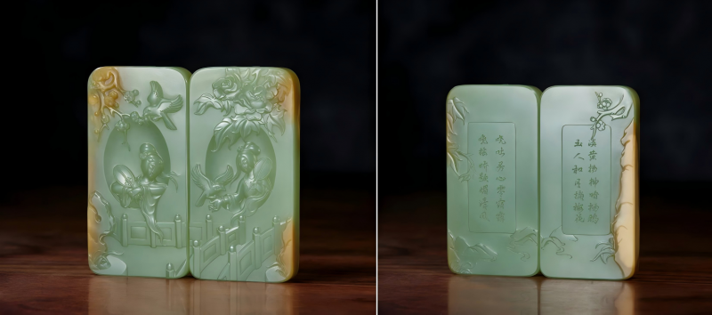 特别是在作品背面琢刻洗练的文字或简洁的诗词,将诗、书、画统一表现在和田玉上,体现了玉雕艺术的精细文人风尚,延续着七千年未断的工艺传承。