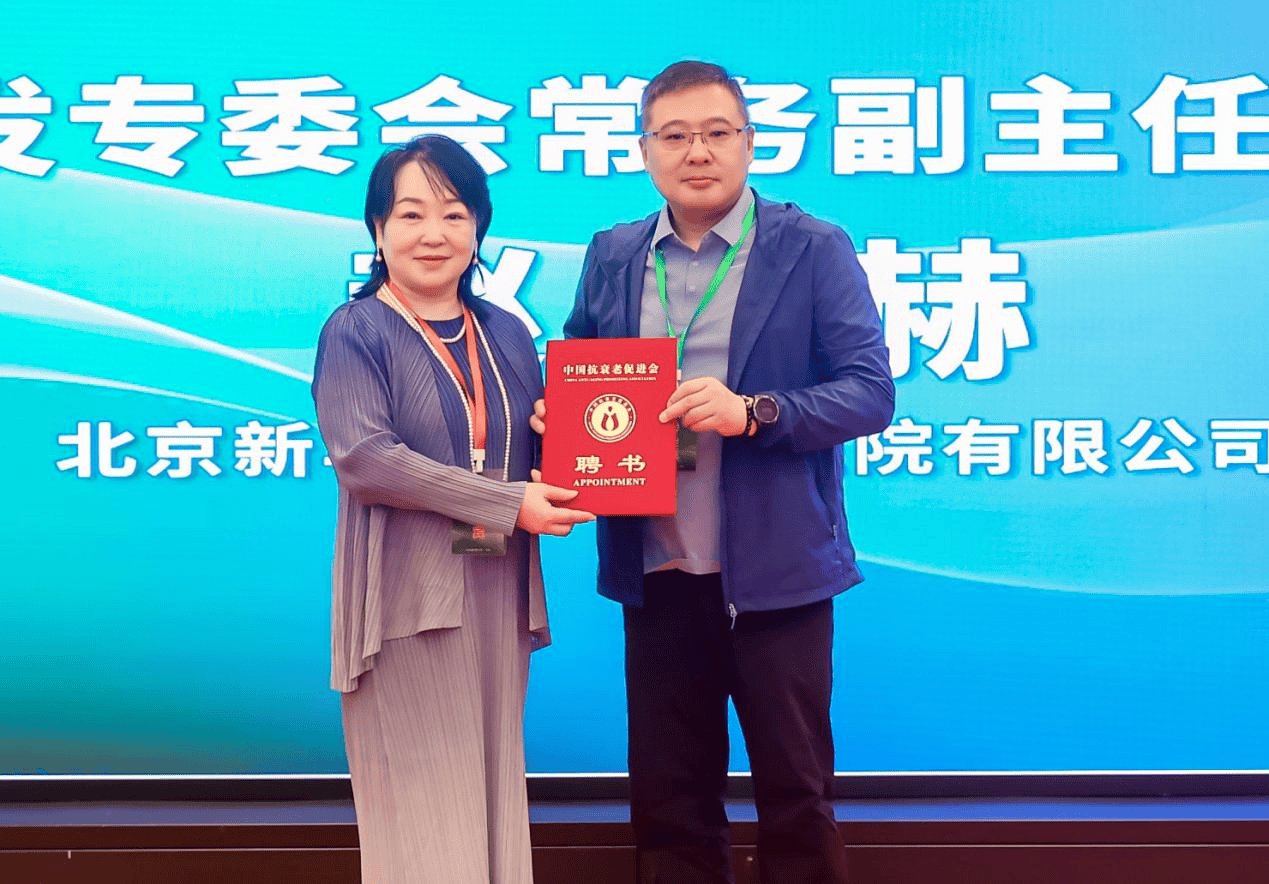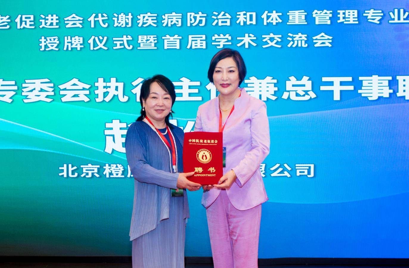 中国抗衰老促进会常务副理事长朱怡霖为北京新华卓越康复医院院长赵子赫颁发常务副主任聘书 ;北京橙康健康管理有限公司董事长赵松青颁发代谢疾病防治和体重管理专业委员会执行主任兼总干事聘书。