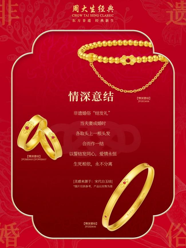 岁月悠悠,柔韧丝线在时光中交织缠绵,仿若情丝,密织成同心结。作为古时常见的经典纹样,同心结承载着深厚的文化意蕴。在古代婚嫁的“合髻”仪式上,新婚夫妻各剪下一缕头发,合而作一结,以誓天赐良缘,更寓意从此结发同心、患难与共。周大生经典取同心结之意,赋予金妆囍事系列“佳缘永结”“情深意结”之形。每处细节都几经打磨,编织出情丝万千,赠予东方佳偶,盟定今朝好姻缘。同心结的中心亦缀有红色珐琅,如同爱情的核心,炽热而坚定;亦祈愿情长岁久,永不渝初。